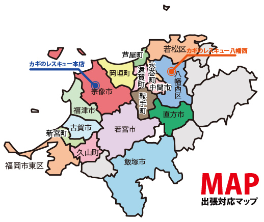 宗像市・福津市・岡垣町・古賀市・新宮町・北九州市八幡西区・北九州市若松区・遠賀郡水巻町・遠賀郡芦屋町・遠賀郡遠賀町・福岡市東区・久山町・宮若・直方・中間市など